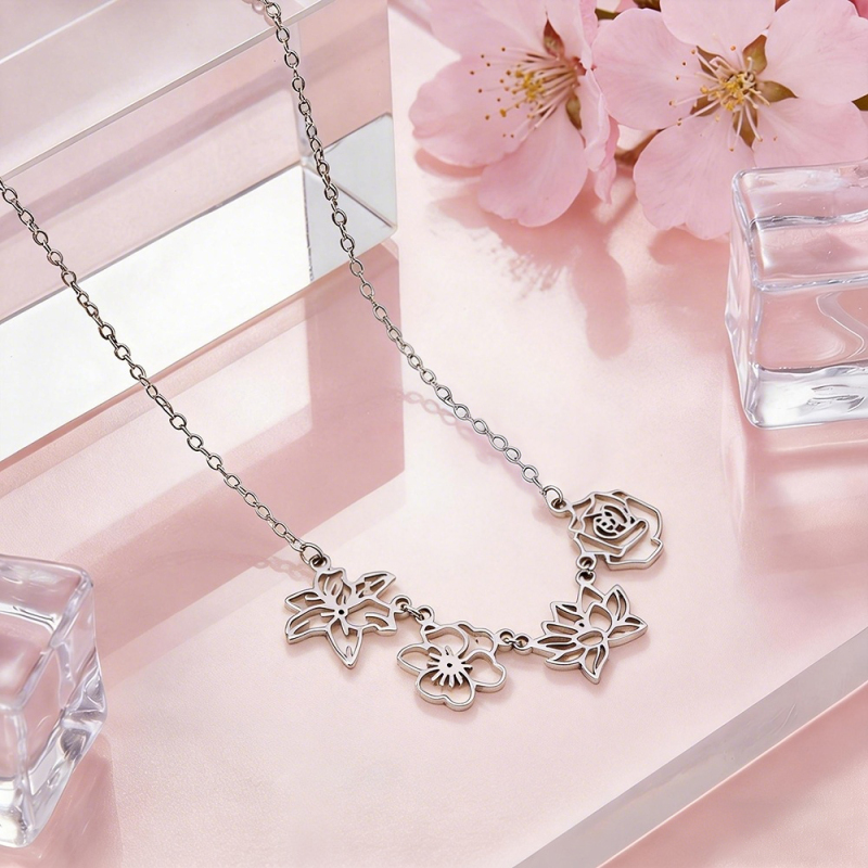 Collier Personnalisé Avec Fleur Et Pierre De Naissance - Pendentif Familial - Collier De Fleurs De Naissance - Collier De Fleurs De Naissance Familial
