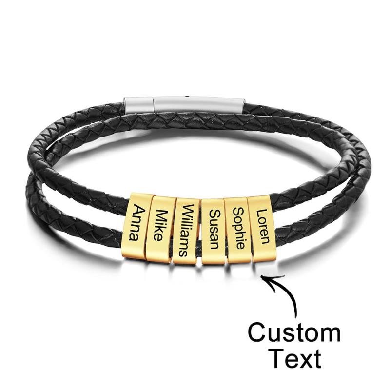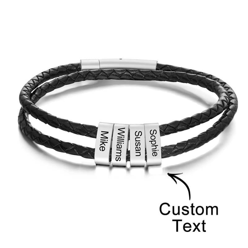 Bracelet Gravé Personnalisé Perles Cuir Tressé Cadeaux Homme