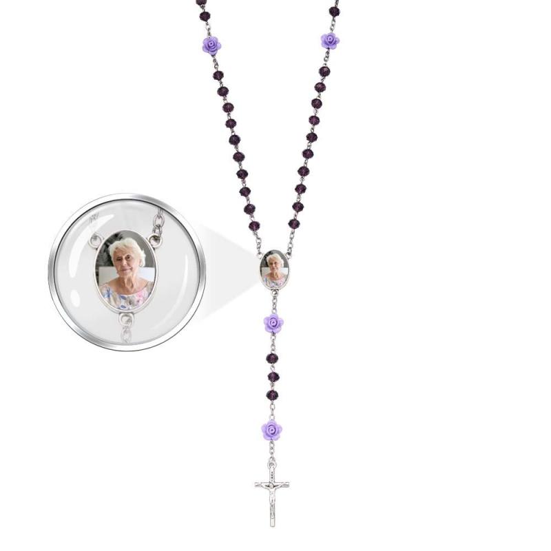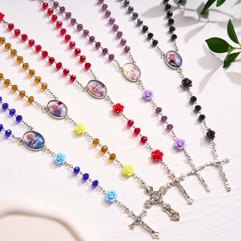 Collier Chapelet Personnalisé En Perles Et Croix, Collier En Cristal Rose Personnalisé Avec Photo