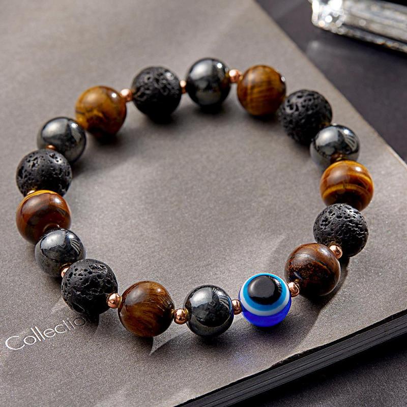 Bracelet Amulette Mauvais Œil Œil De Tigre, Onyx Noir, Pierre De Lave, Perles Pour Hommes