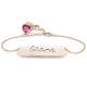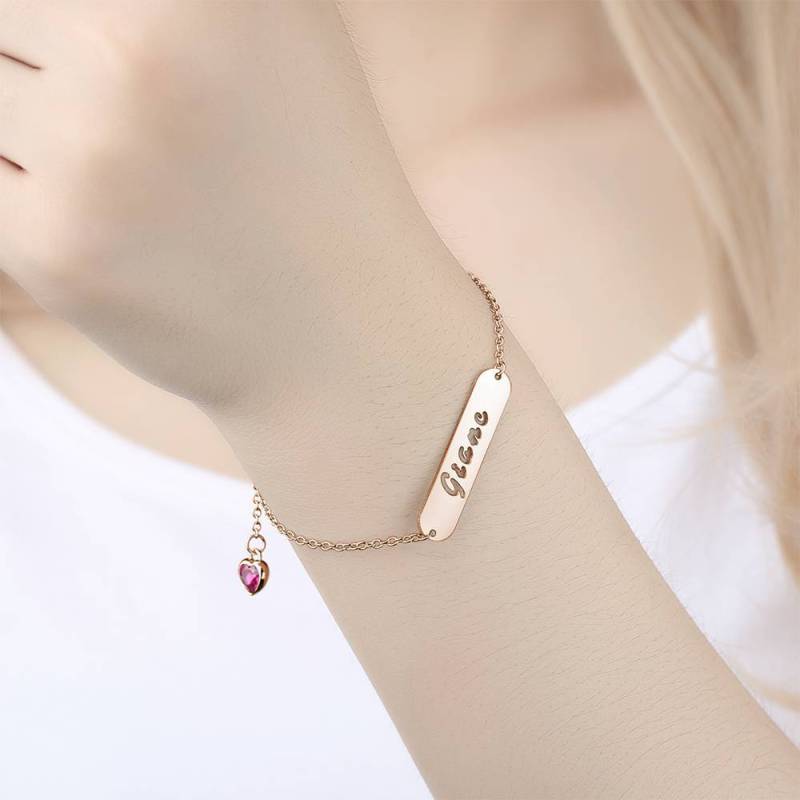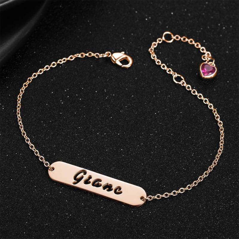 Bracelet Prénom Barre Sculptée Creuse avec Pierre de Naissance en Forme de Coeur Plaqué Or Rose