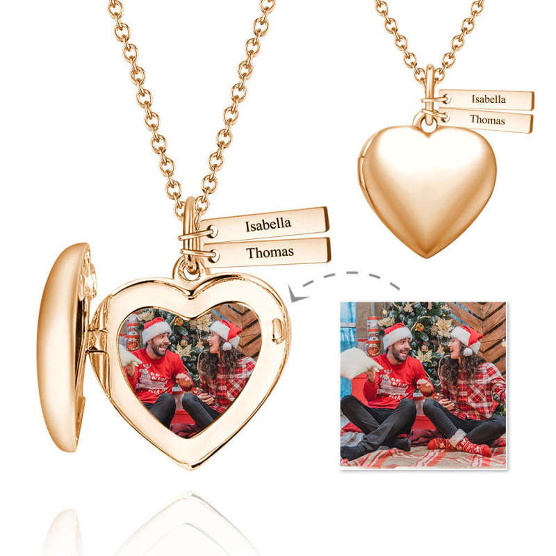 Collier Photo Médaillon Coeur Avec Deux Barres à Graver Plaqué Or Rose
