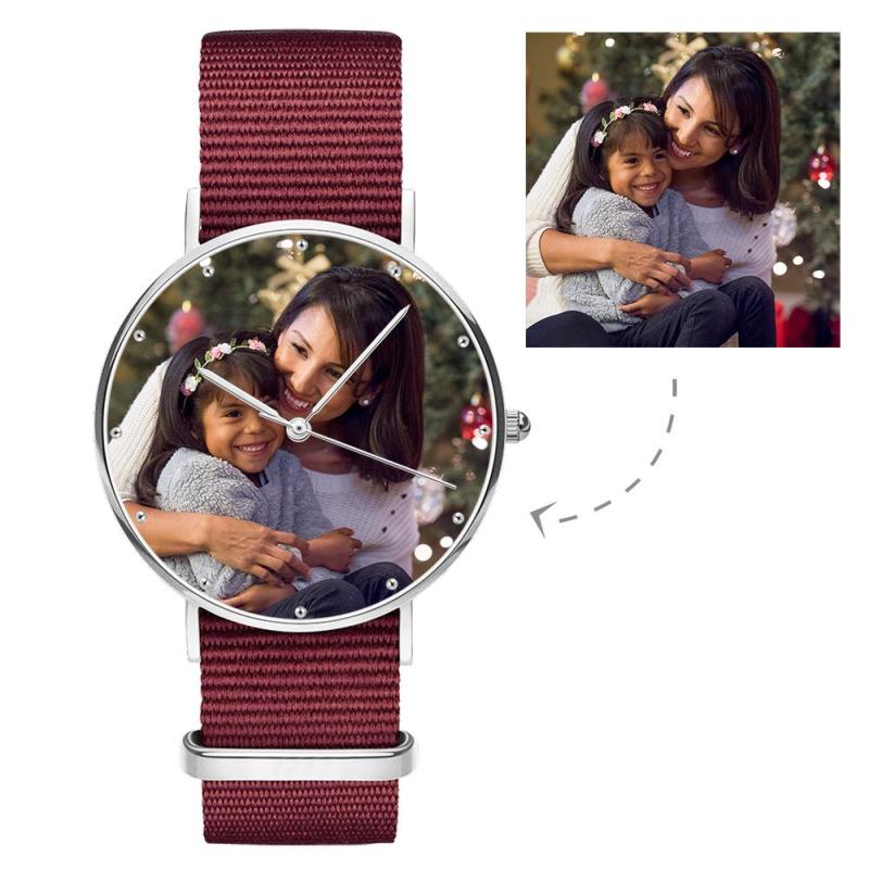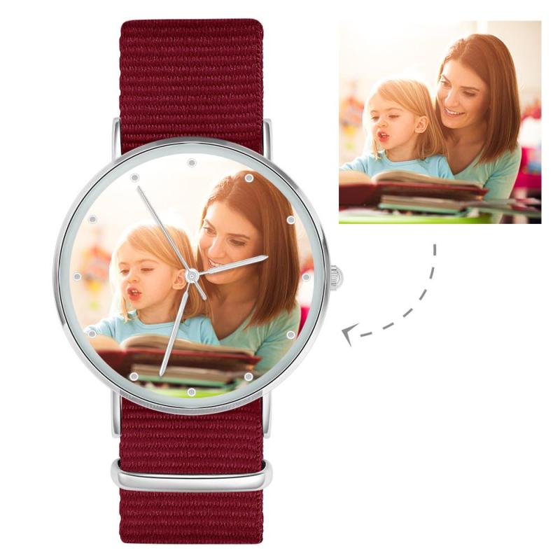 Cadeau d'Anniversaire du Père - Montre Gravée Personnalisée, Personnaliser Votre Propre Montre en Photo avec Bracelet Rouge