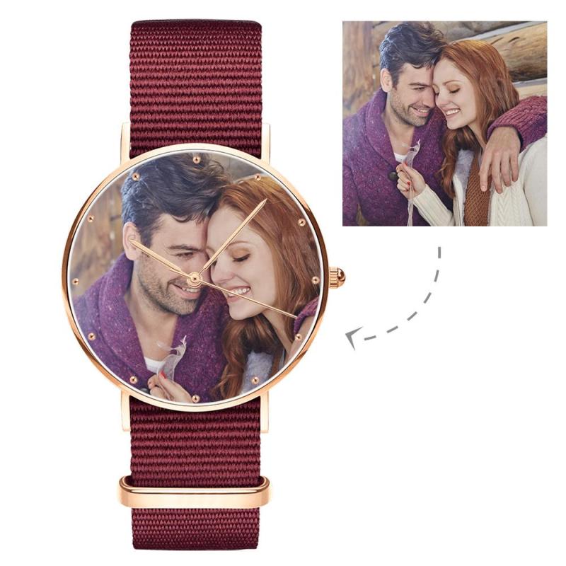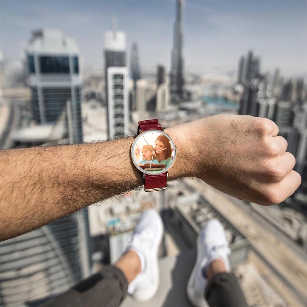 Montre Gravée Personnalisée, Personnaliser Votre Propre Montre en Photo avec Bracelet Rouge - Cadeau pour le Petit Ami