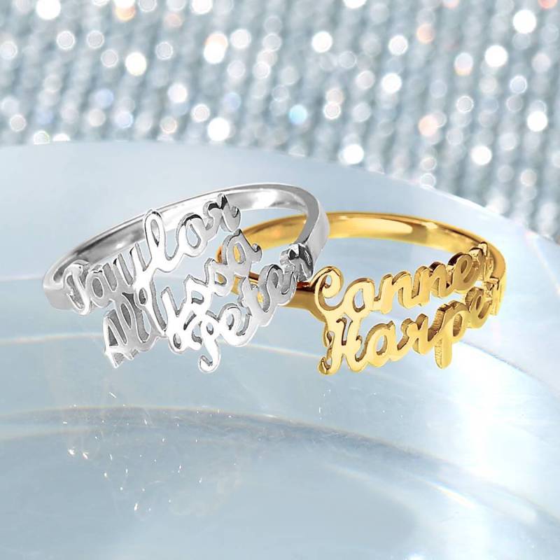 Bague à deux prénoms en argent plaqué or 14 carats pour elle