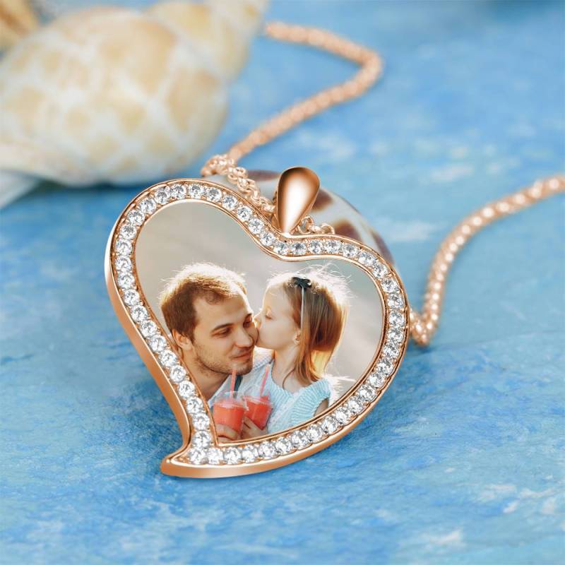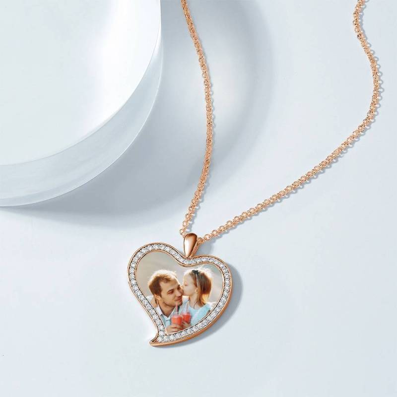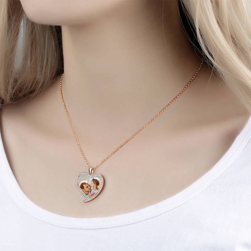 Femme Collier Personnalisé Gravé en Photo , Strass Cristal Amour Coeur Forme Collier en Photo Rose Plaqué Or - Coloré
